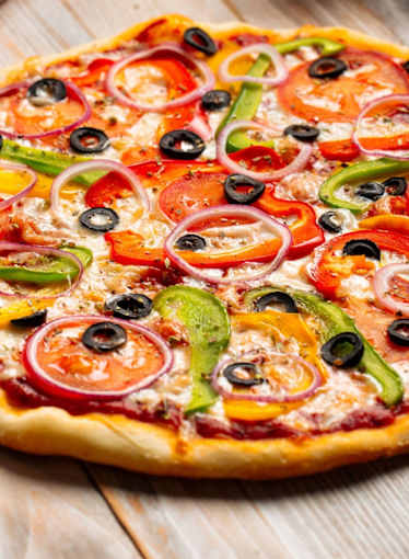 Tomato base, capsicum, fresh tomato, mushrooms, olives, pineapple, red onions, cheese.